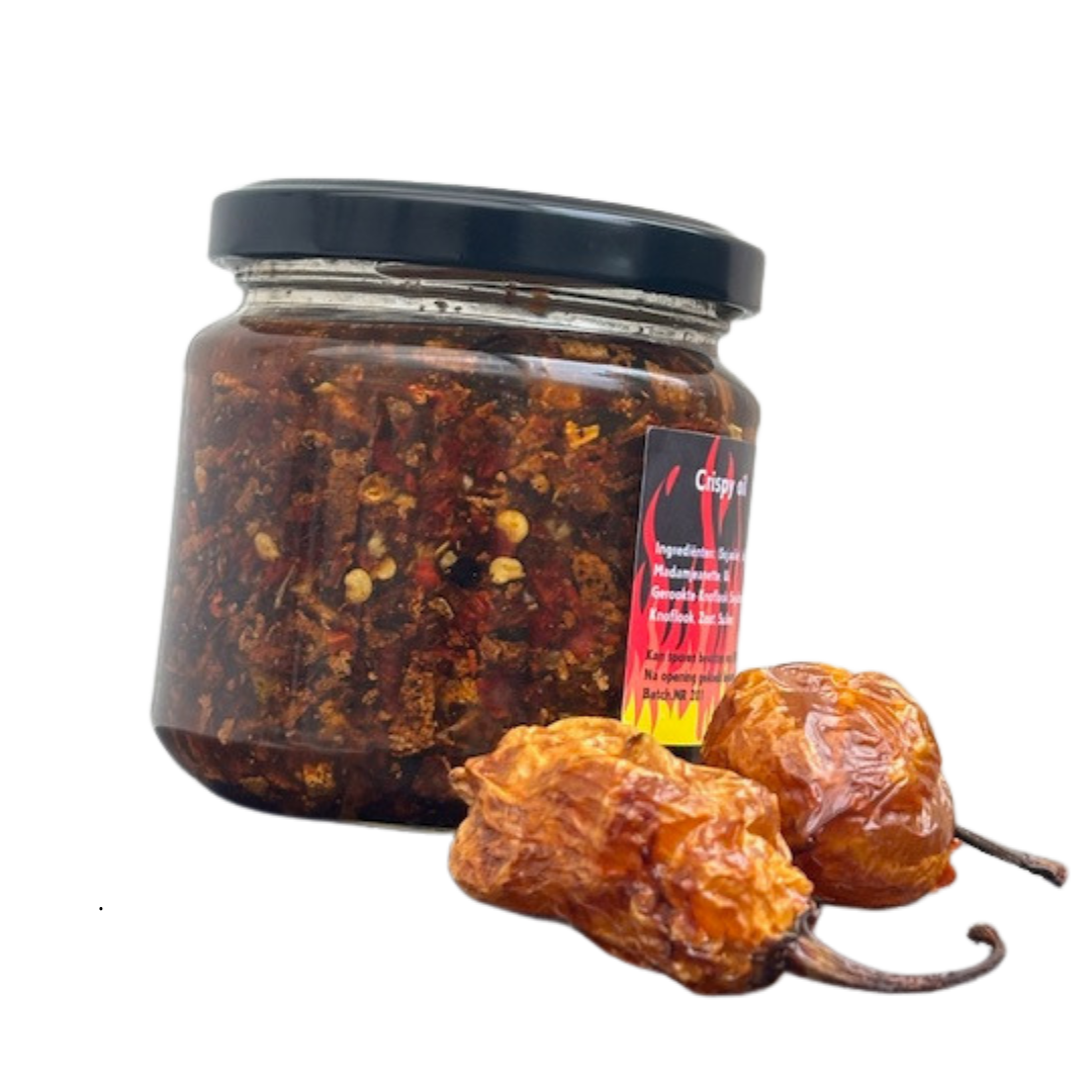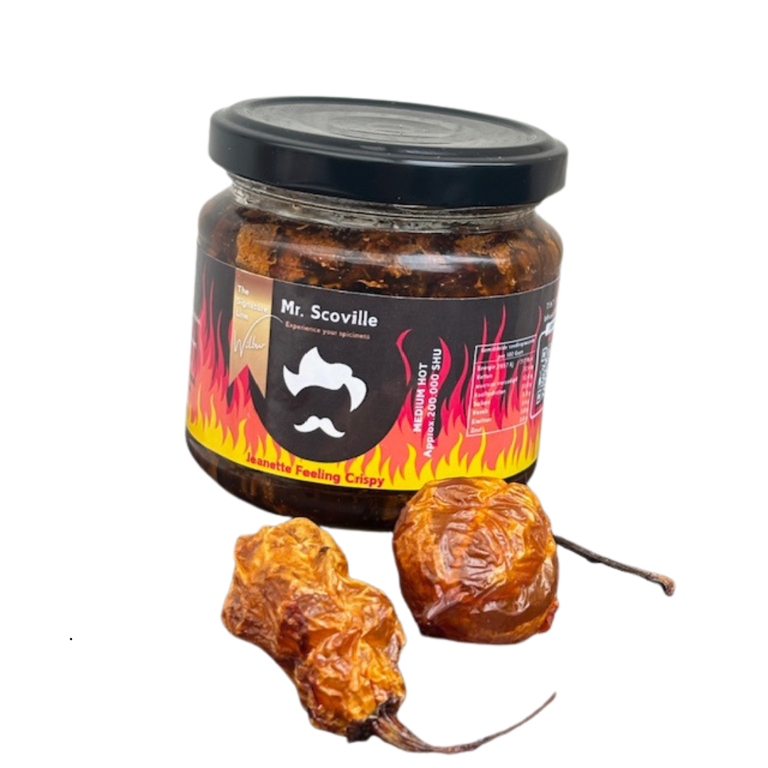 The Jeanette Feeling Crispy Oil is specially formulated for those who love a balanced, fruity kick with a surprising crunch. This crispy chili oil is generously packed with crispy fried onions, garlic, and of course, the iconic Madame Jeanette pepper – known for its fresh, citrusy flavor and pleasant heat.